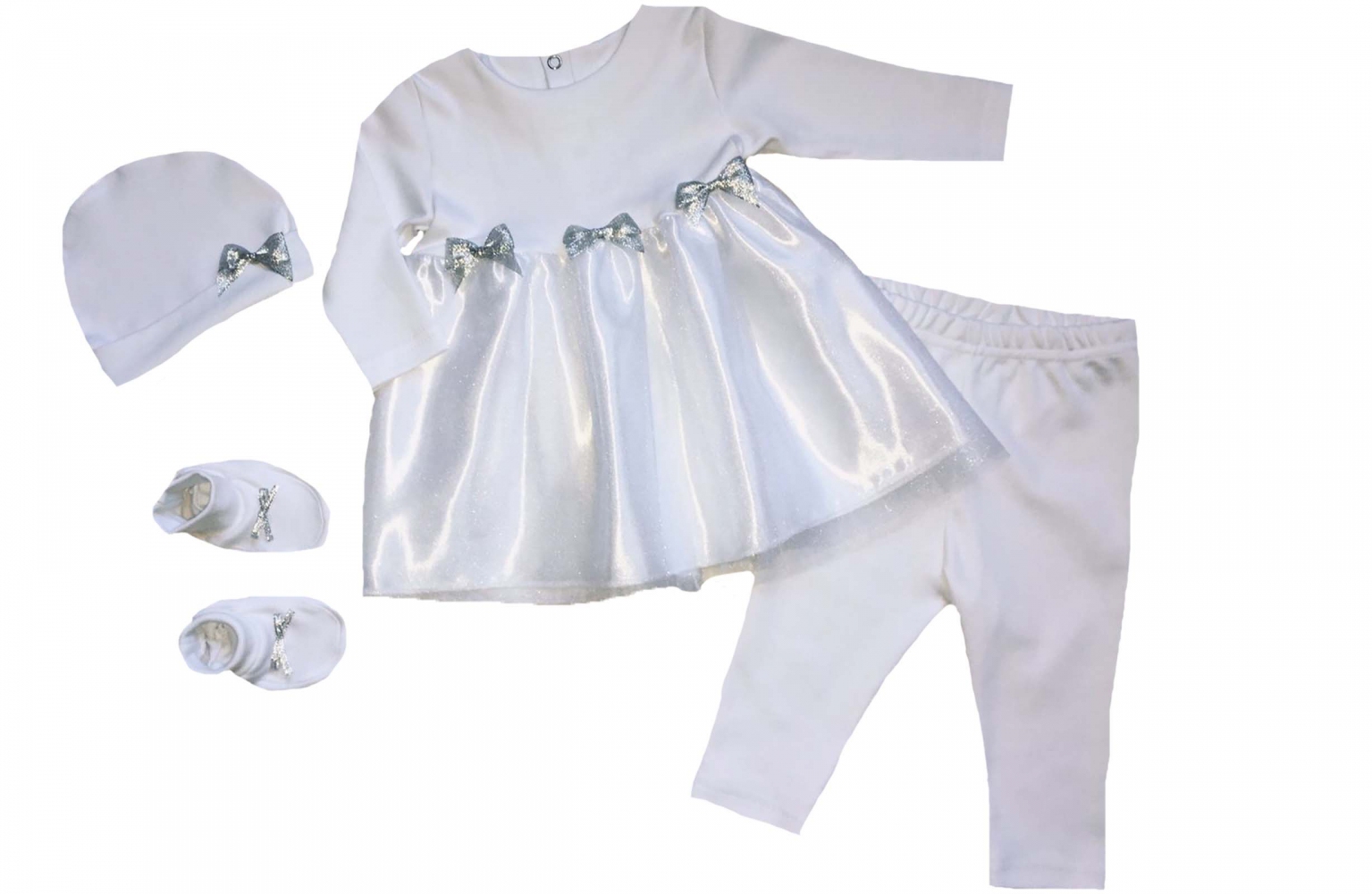 В набір входить: сукня, штани, пінетки, шапочка.